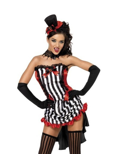 This sexy vampire not only sucks the blood of her victims, but she dances for them as well! This Vamp Costume features a burlesque style outfit with a strapless bodice and a bustle back. The corset has black and white stripes with red trim and red bow accents. The skirt has black and white stripes with a red hem in front and a black bustle in the back.With hat, top and skirt. Gloves is not included.