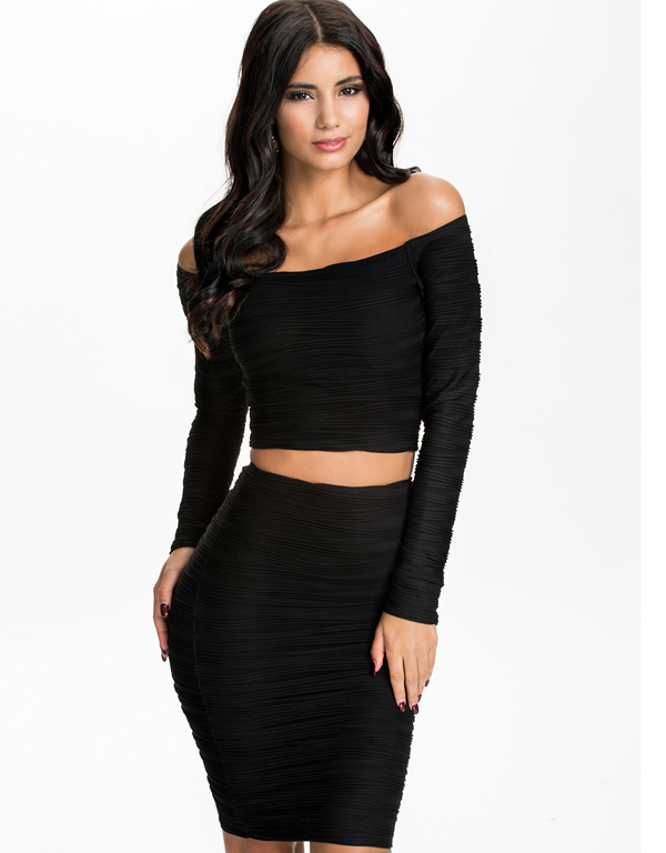 This season we are spoiled for choice when it comes to set. The Subtle Pleats Textured Off-shoulder Skirt Set is characterized by exquisitely textured shell, sexy off-shoulder design, long-sleeved top and knee-length skirt in a tight fit. Style with your glittering fashion jewelries and chunky ankle boots for a tough take on the noble style.