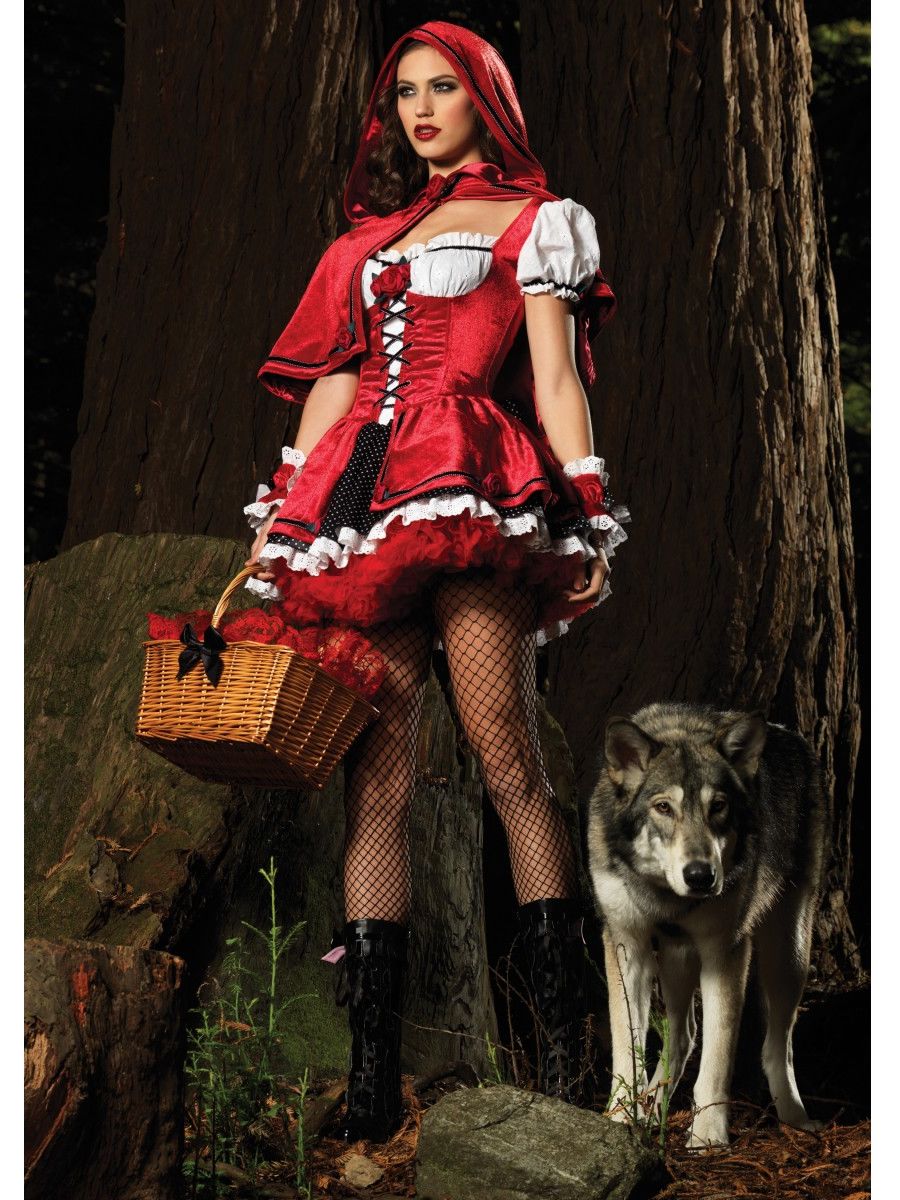Wholesale Costumes.The Sultry Red Riding Hood Costume features sultry red double shoulder coat with lace ribbon trim,buil-in white dress with rose wave trimed attached puff sleeve.It also includes a hooded cape and a wrist cuffs.Basket and stockings not included.