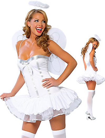 Wholesale Sexy Costumes.The three-piece Adult Sexy Angel costume includes tube dress with low deep-v neck attached fine boning, built-in petticoat and bow accent, Angel's halo and wings. Stockings not included.