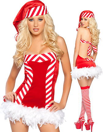 This sweet girl costume with the candy style make you delicious as well and the white and red stripe around the body and the hat.The almost backless design with the tie.