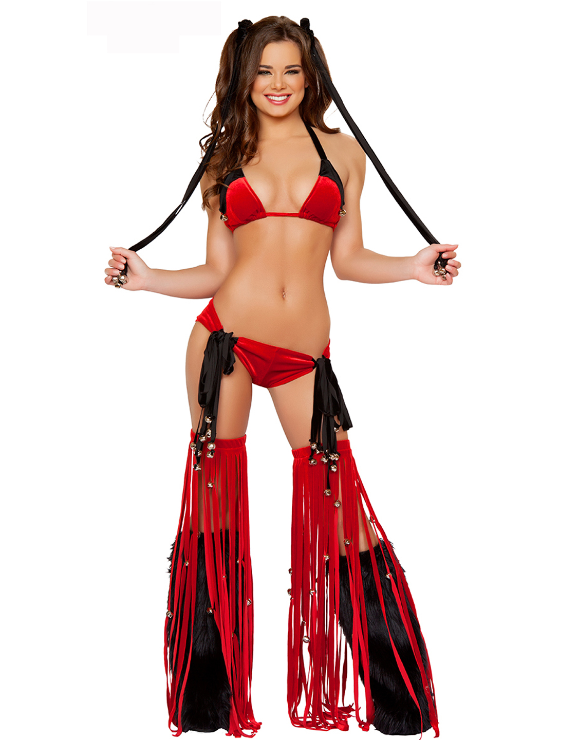 This five-piece Tassel Bell Bra Set Christmas Costumes feacture the triangle top that features jingle bell trim and a tie back and the matching side tie shorts that feature bells on the black fringe accents. Perfect for making a statement this Holiday season!