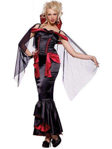 In Our Wholesale Halloween Costumes Store. 2 PCS Vampire Mistress Halloween Costume includes long satin fold dress with layer hem trim detail,stay-up collar,rose belt and a transparent ribbon back.Need hat independent sales.Fabric:Polyester/Spandex.Know more about our similar products,pls visit our website: www.wonderbeautylingerie.com