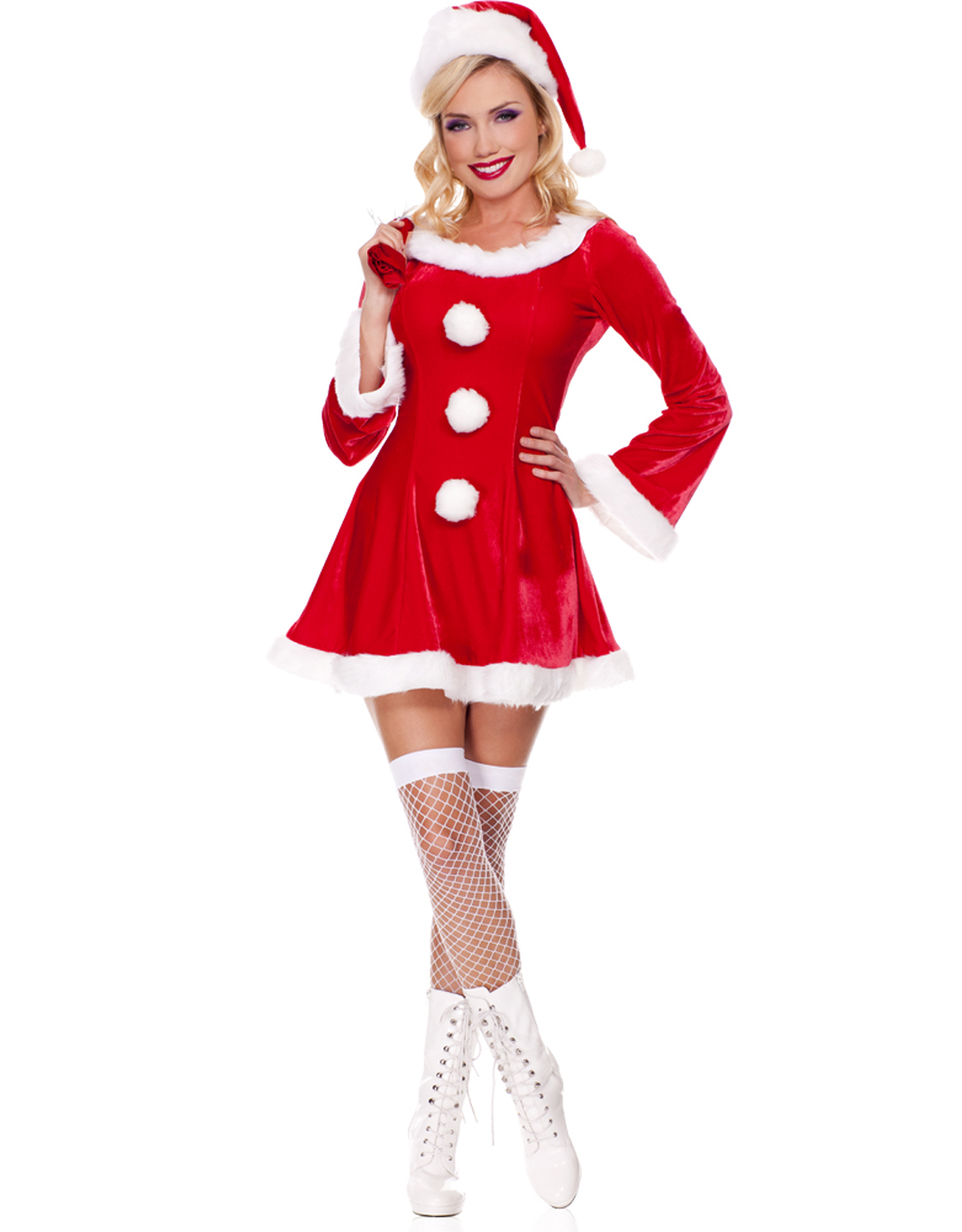 The White Fur Ball Christmas Dress is a two-piece set that features a red long sleeve A-line dress with white fur trim and white pom pom accents. It also includes a Santa hat. Please note that stockings not included.