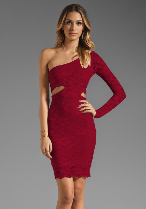 Wine Red One Shoulder Lace Dress is designed with a bodycon fit and a mini cut length. The lace with cut-out design and looks luscious. This stretchy knit dress pairs classy curves with a unique shoulder silhouette for a flattering feminine look. Show off your curves with this glamorous bodycon dress.