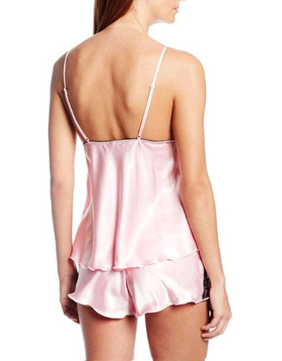 This women's 2 piece shirt shorts sleepwear set features low cut front, satin top with black lace center panel, ajustable straps. Shorts with lace detail top and sides. It is very comfortable to wear. Also available in blue, green, black and white.